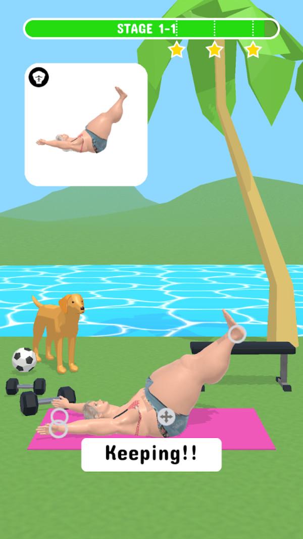想要拥有魔鬼的身材吗?想要走出门就有120%的回头率吗?来锻炼吧女王游戏,跟着游戏一起锻炼你的身体,玩家需要将游戏人物摆成关卡图片提示的样子。在移动过程中往往会出现人物模型手脚不协同的样子,非常的搞笑且魔性,有时候甚至发现不出来是什么出现了问题,但总觉得不太对,哈哈模型搞定了动作,我们自己也要学着做哦!这个暑假可要保持好身材呢!