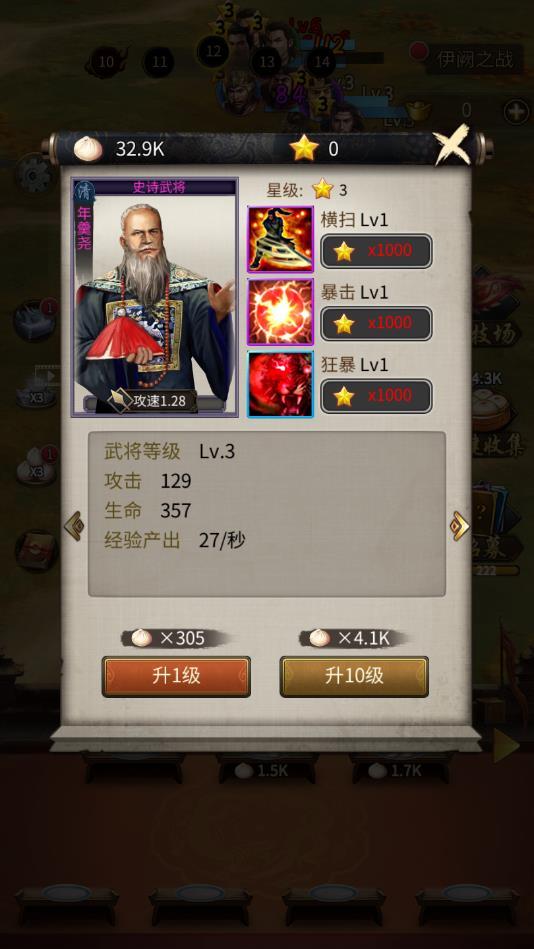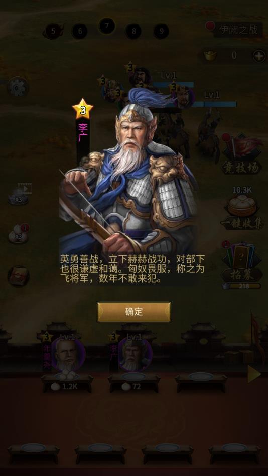 非常有趣的放置战斗玩法,不断进行更多资源的收集,才能够进行更多名将的招募,名将是能够升级的,不同关卡可以上阵不一样数量的英雄。