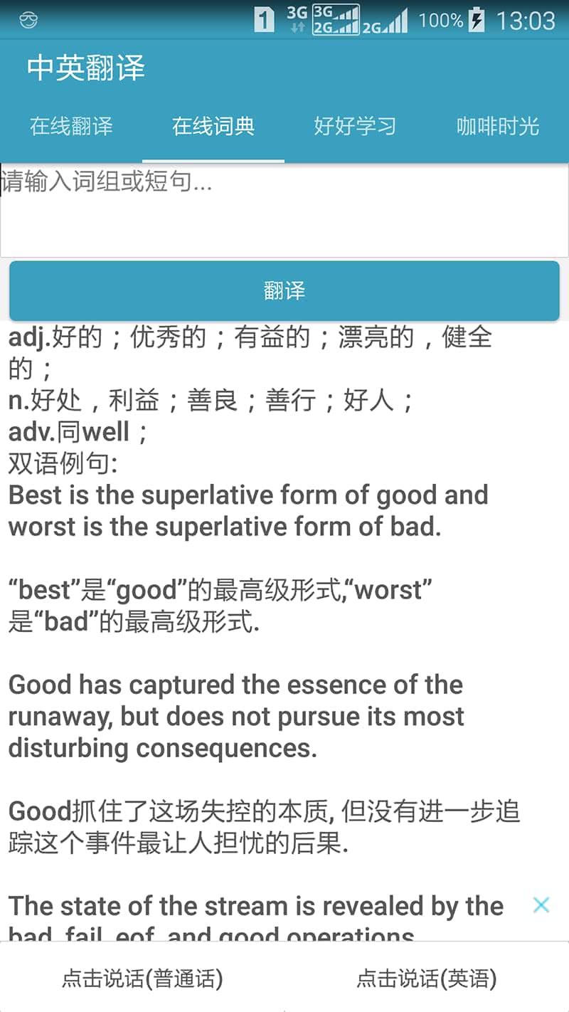 1、在线翻译。语音输入,语音输出。中译英、英译中。