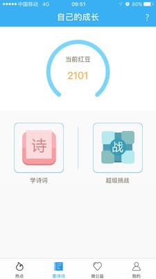 2 添加传统文化、爱诗词板块。新增的学诗词和超级挑战可以赚取红豆,并在做公益板块可以捐赠红豆