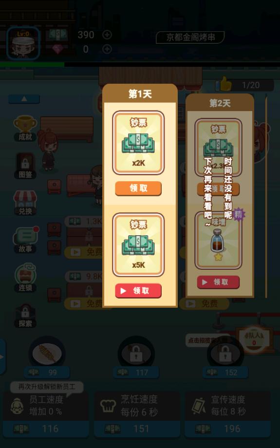 达到一定的等级,装修更豪华的桌椅也能增加收益,提升产品的产量,让顾客可以更快的吃到烧烤。