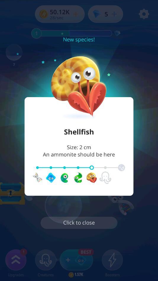 每过10秒在游戏中出现一个水泡,点破它就会出现一个非常卡通的DNA,用两个DNA就可以合成细胞了。游戏中有非常多的生物,都是通过下一级别的合成而来,玩起来非常的需要时间,如果需要进化成人类就需要很久。