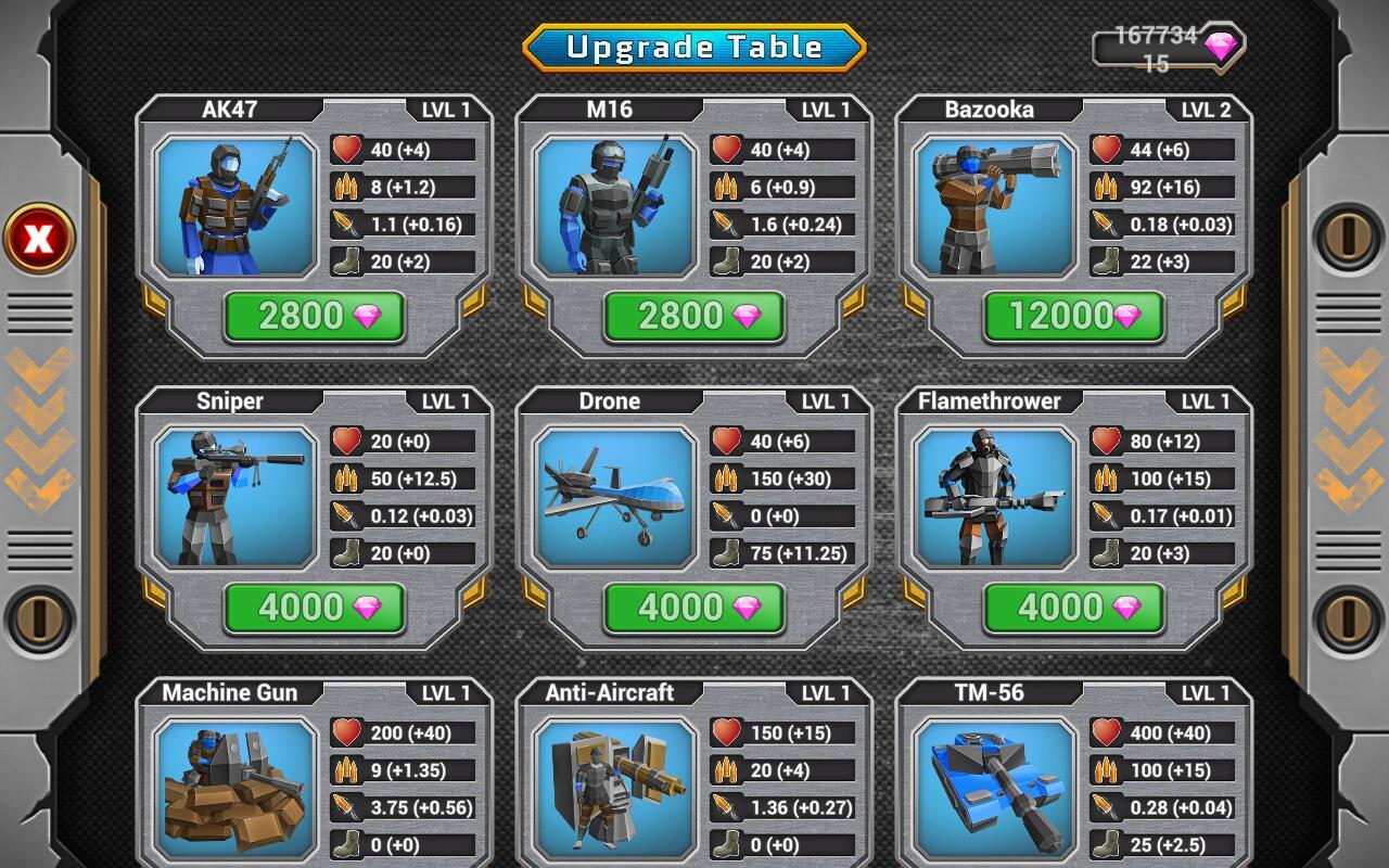 陆军战争模拟器无限钻石版,进入游戏后玩家就可以获得无限钻石,钻石可以升级玩家的兵种,让他们变得更加厉害,有更加强大的威力,而且游戏中玩家的每一次战斗都可以学习到新的知识,战斗也会更加的有趣。