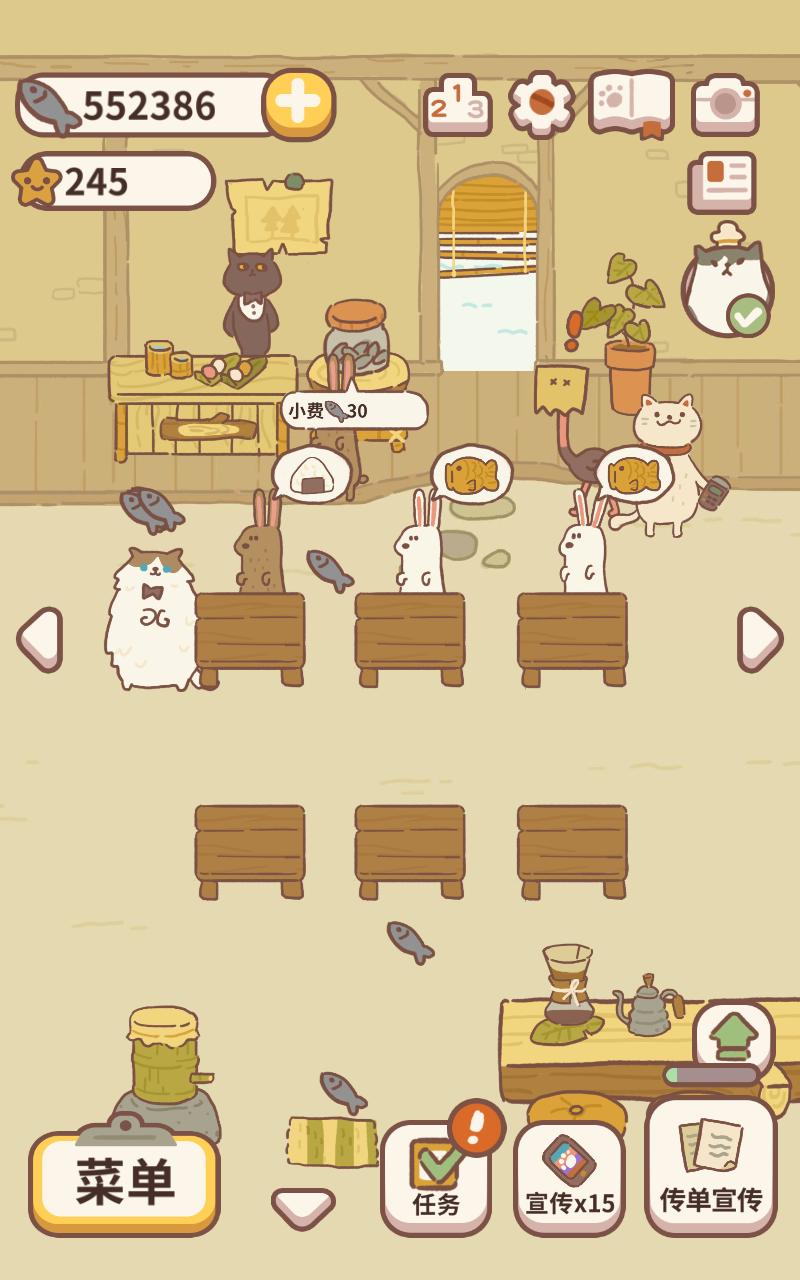 4、一款卡通风格的经营模拟手游,主要就是通过小鱼干来购买一些餐厅设施和解锁新的菜谱。