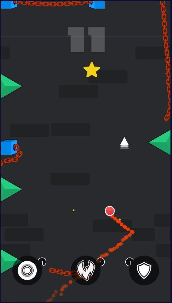 打破绳索,游戏开始玩就可以看到你的前面有很多的锁链,旁边也有很多的尖刺,玩家的任务就是控制着脆弱的小球躲避锁链和尖刺,因为会有一个三角形在前方开路,所以玩家也不用太担心,但是当三角形破开绳索,断的绳索也有可能掉到小球身上。