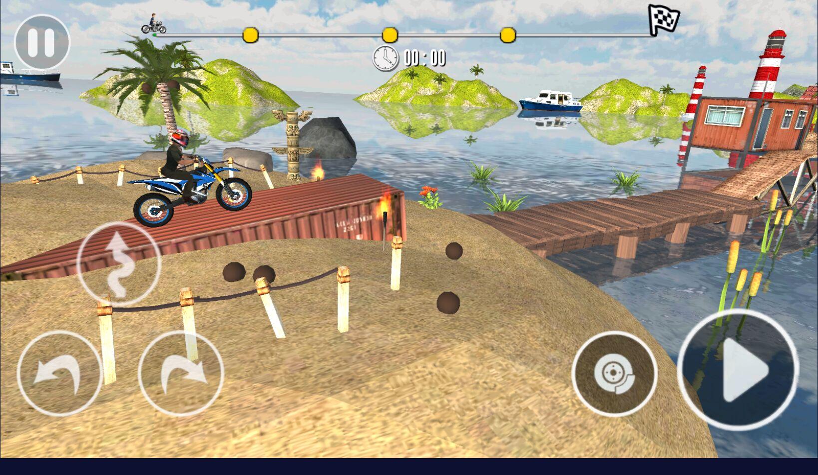 四种极具特点的摩托供你选择,尽情在赛道上驰骋,展现你的特技,热带岛屿水上搭建赛道、难度各异的巨石阵,清凉一夏极限挑战;
