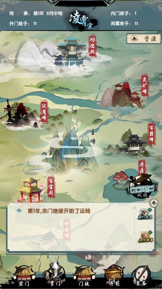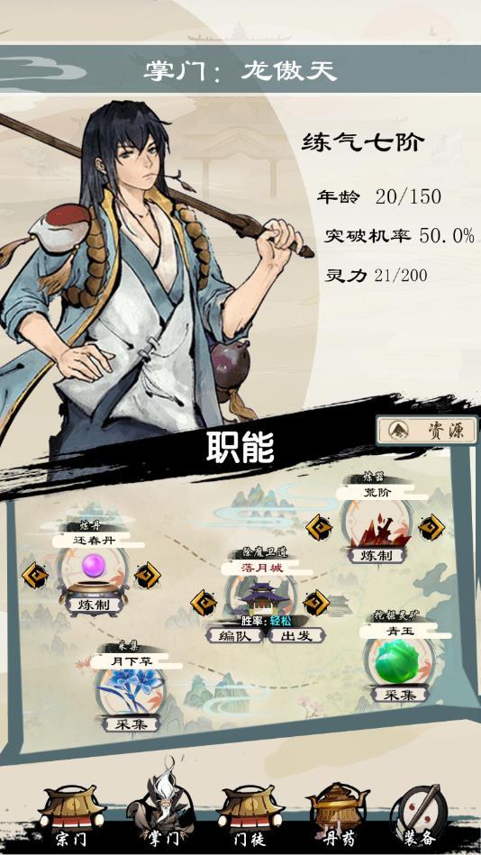 门派的各种资源都可以通过到江湖中占据资源点进行生产,招募杂役去生产,每次打开游戏都可在门派中收获定量资源。