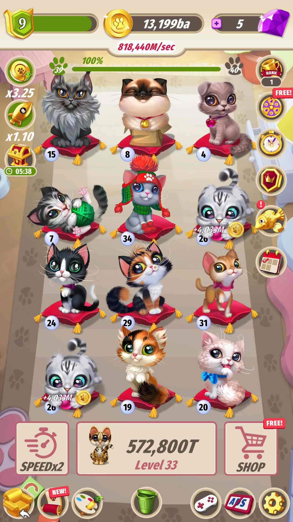 2、当小猫咪的级数达到一定等级后,就能够进行合并了,有机会产生出稀有品种哦。