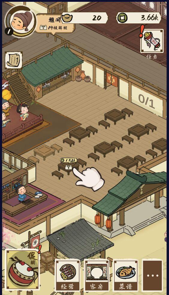 多种建筑任意搭配,清风间、凌云间、书斋、浴堂,建造繁华的客栈时要注意房间的属性搭配哦。