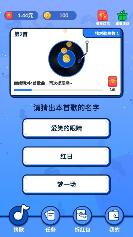 游戏玩法非常简单且具有创意,让你在进行非常休闲的猜歌名玩法时,还能够进行零花钱的赚取,指尖点击即可进行不同答案的选择,操作是非常简单的。