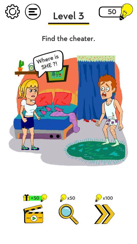 第三个问题是找出藏在男人房间的女人,可以看到窗帘下红色的鞋子,点击窗帘就行了。
