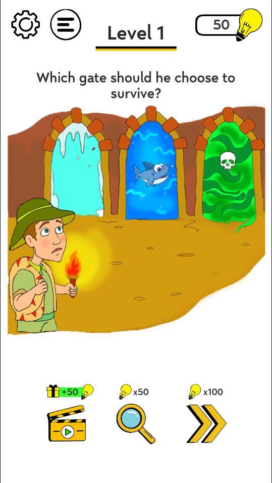 第一关的问题是找出哪一个门是能够正确逃生的,选择没有食人鱼和骷髅的那个;