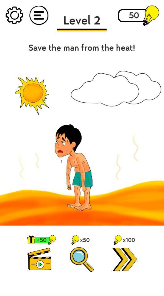 第二个是男人在沙漠中太热了,玩家需要救救他,用白云将太阳遮挡起来;