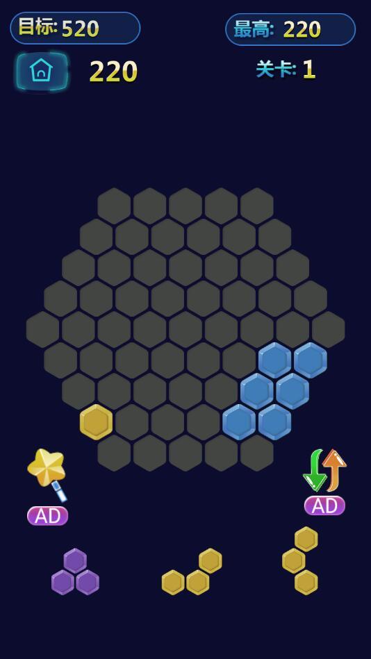 容易上手、轻松休闲的策略游戏,六角俄罗斯方块堆放消除;