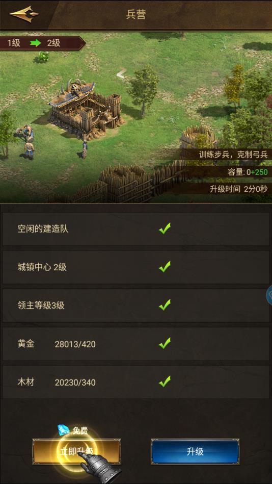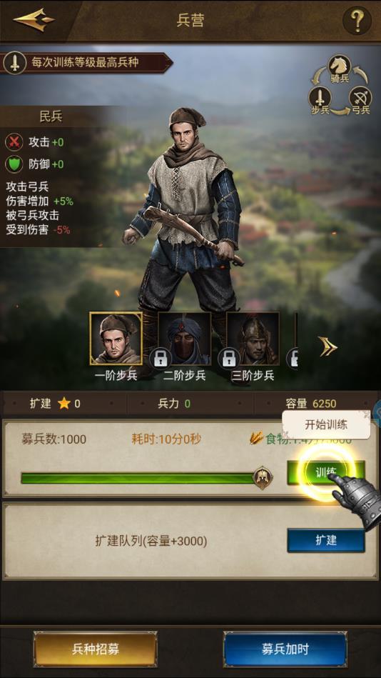 万国征战感受非常恢弘大气的战斗场面,自由进行多样兵种的培养,进行非常热血的战争场面,不同的兵种是存在着克制关系的,支持进行兵营的升级以及士兵的训练,轻松就可以开启一场又一场非常精彩的战争。