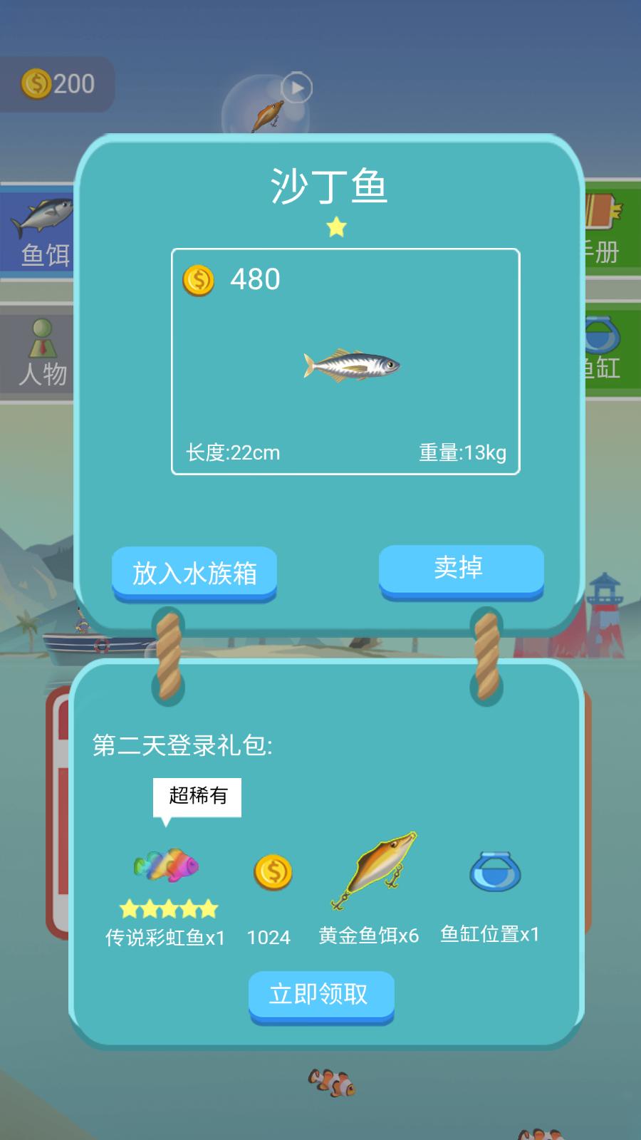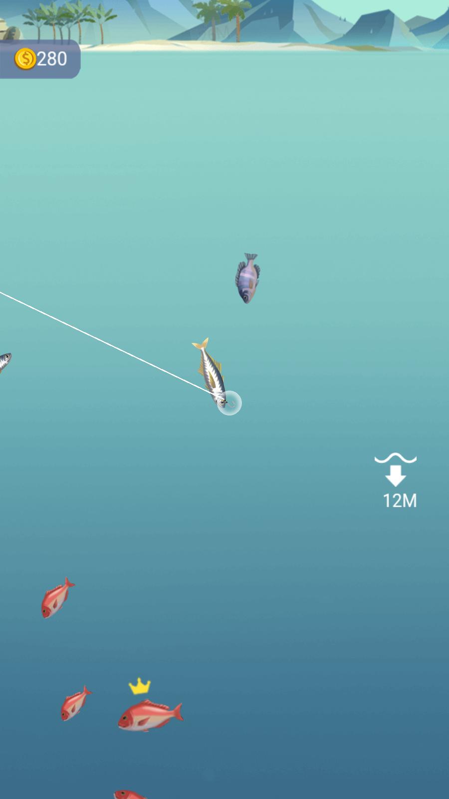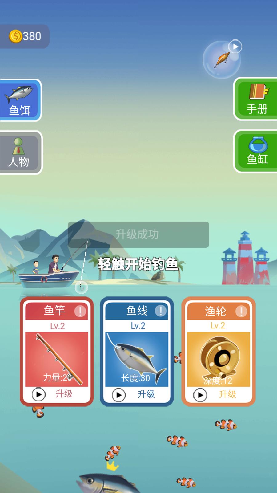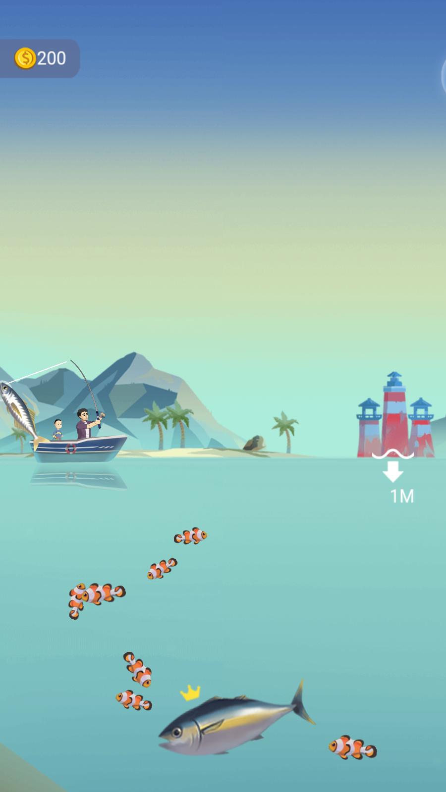 简单的玩法,甩动鱼竿把鱼饵扔到海中,很快鱼就会上钩;