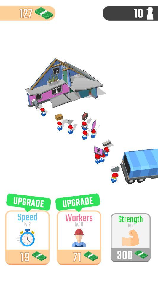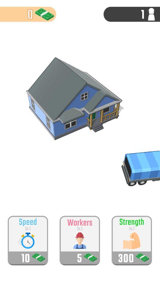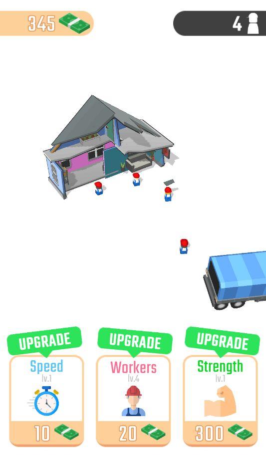 小小拆迁队,这是一款比较卡通的游戏,玩家的任务是招募拆迁队将房子给拆掉,一开始玩家招募的人很少,不管是生产钞票还是拆迁房子都很慢,玩家这个时候可以选择加快速度,也可以选择增强拆迁队体质,不过这些对于玩家来说都非常的费钱,所以玩家需要获得更多的钞票,不然就只能慢慢的拆迁。