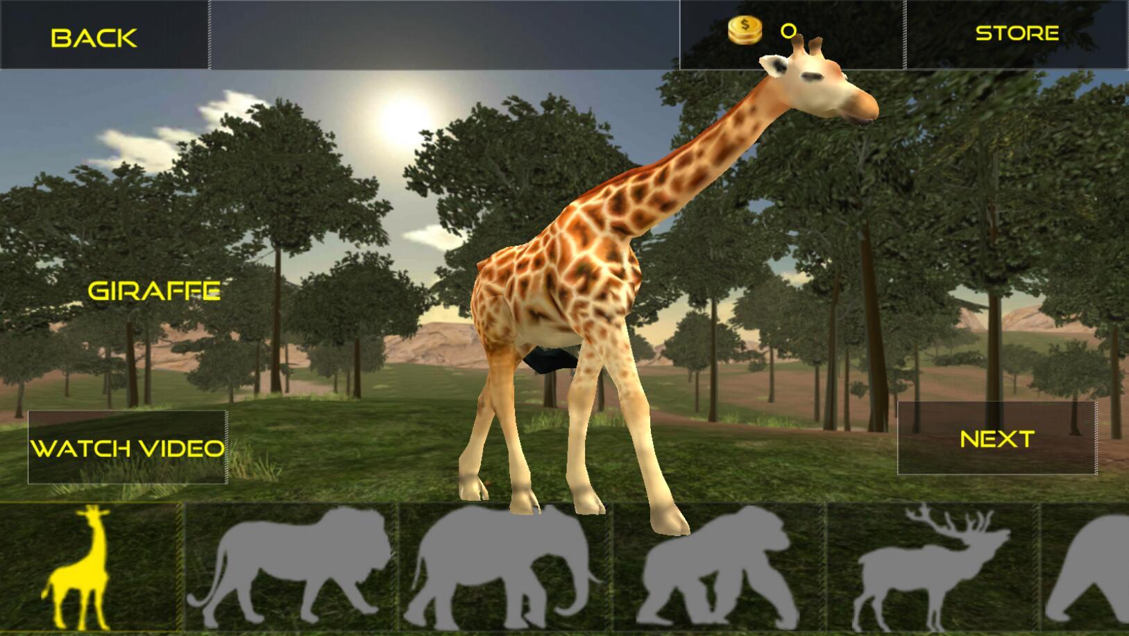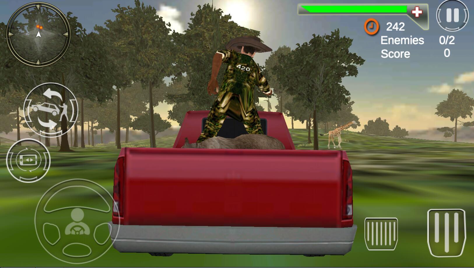 越野自由打猎,进入游戏玩家就可以看见很多的动物,玩家现在能够选择的只有长颈鹿,选好动物,枪械和车后玩家来到了游戏里,这个时候玩家是在一辆车上的,你的车里面有一头猎物,而玩家需要做的事情就是不断的猎杀更多的动物,这样玩家才能够获得更多的金币,然后解锁更好的枪支。