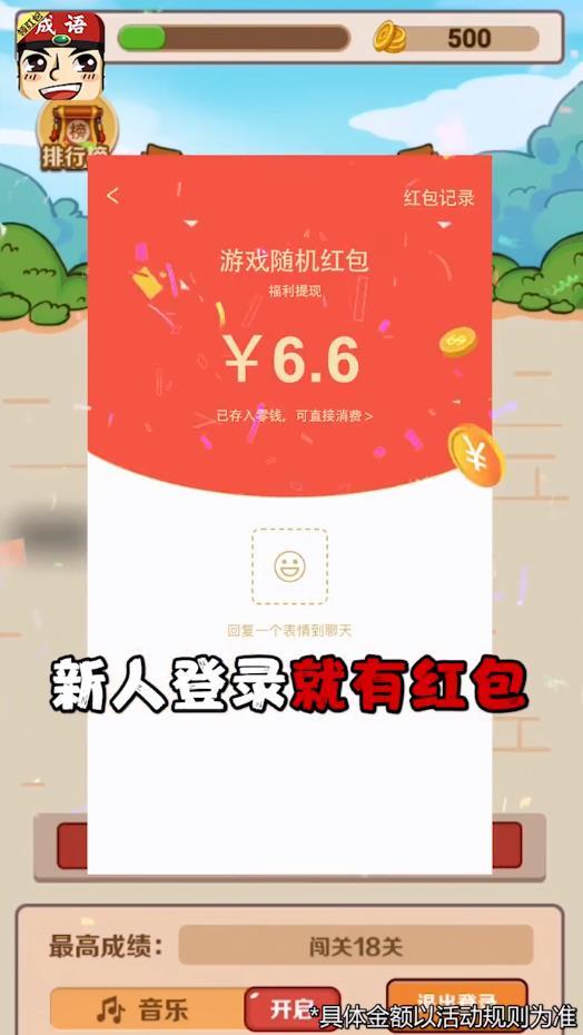 非常经典的答题闯关游戏玩法,每一关的成语都是不一样的,每一关的题目都是充满着挑战性的,点击即可进行红包的提现,快速就可以到账。