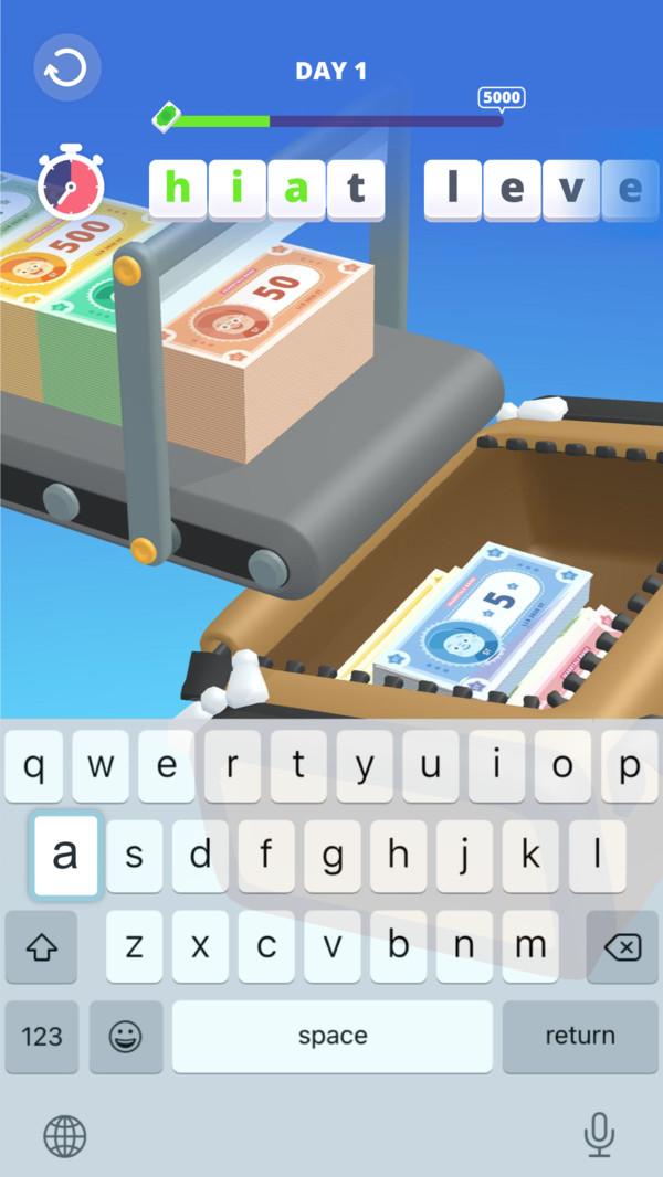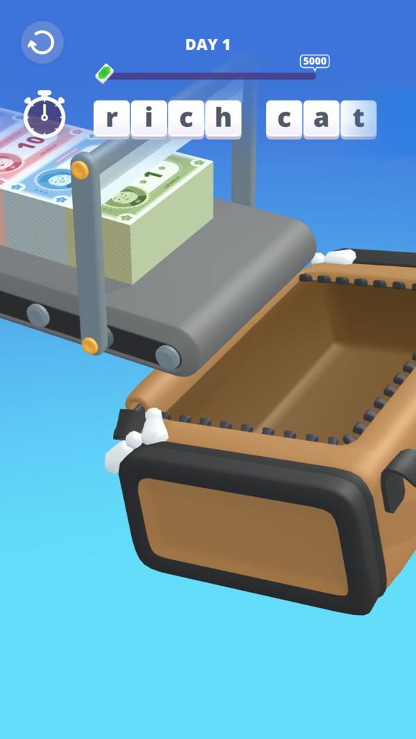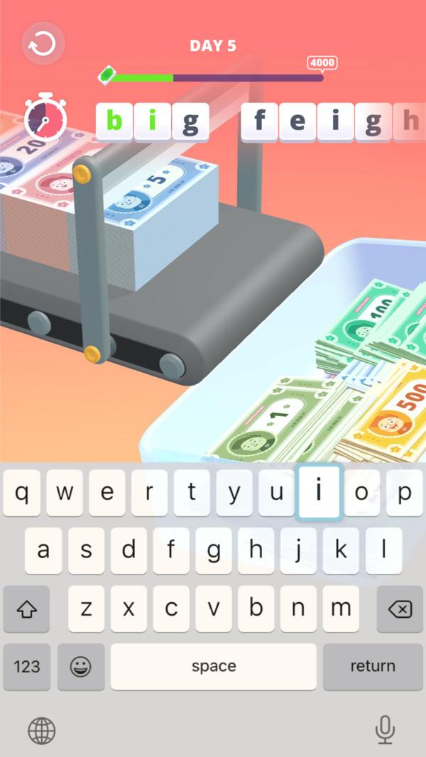 不会吧不会吧,打字也能成为百万富翁?没错,在这款切割纸币游戏中,确实可以做到,只要你打字够快,积累千万资产也并非不可能。这款游戏的创意十分的独特,玩法也很新颖,玩家在游戏中只需要不断地敲击屏幕上给出的字母,铡刀就会不断的切割纸币,你敲得越快,铡刀自然也切的越快。成为世界首富,就看这一把了。