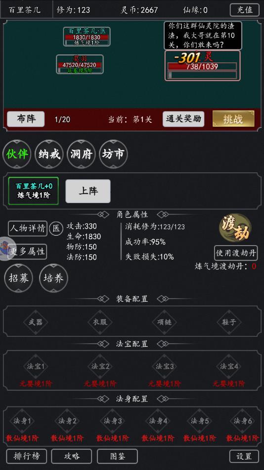 游戏玩法是非常简单,轻松就可以进行文字修仙,在这里一应俱全,你可以同过不断战斗的方式,进行多样资源的获取以及角色经验的积累,才能够更好的进行晋级。