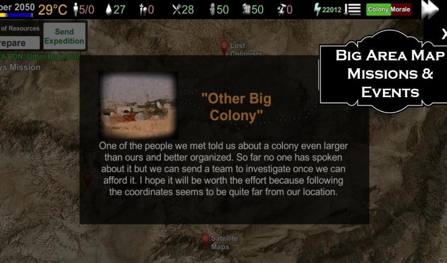 *发现殖民地周围的大地图,并派出研究小组执行任务,以找到改善生活的方法。