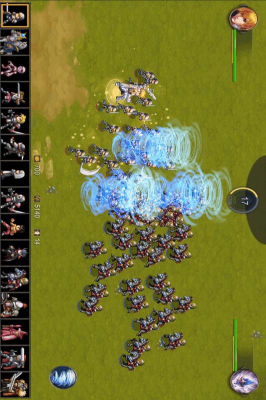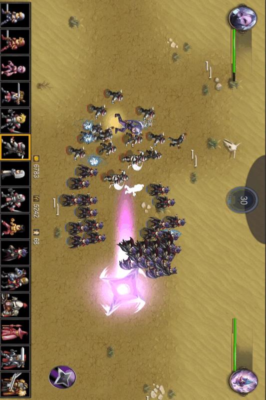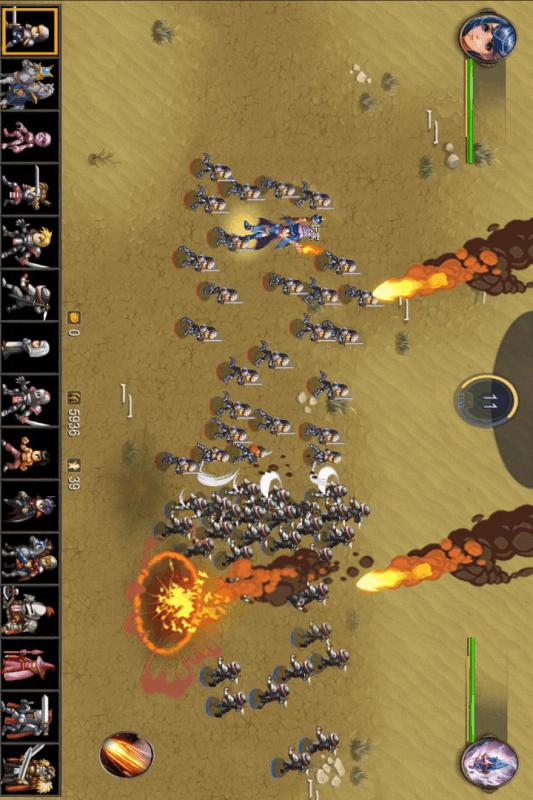 游戏界面的顶部会有一个倒计时,玩家可以选择合适的士兵在底部战斗。当时间是0并且钱足够派遣军队时,士兵会自动攻击