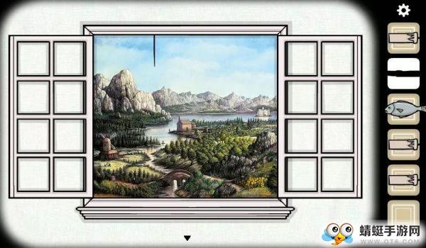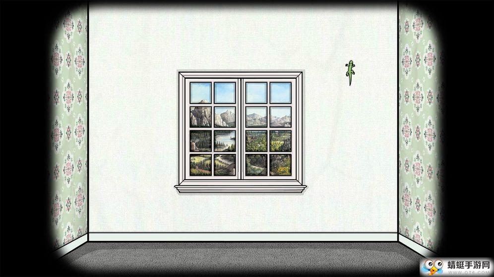 再往左转是一台座钟,指针可以拨动,另外下方钟柜需要特殊的钥匙打开。后文再说。继续往左转看到一扇窗户,外面的风景是锈湖的经典场景,但是一条缝表明这只是一张风景画。墙上还有一只绿色的壁虎,点击会爬走。但是现在没法抓住它,我们后面再说。