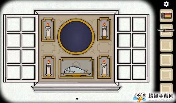 用火柴点亮四根蜡烛,中间的圆圈便打开了。托盘上摆上鱼,点击圆圈可以看到白色立方体。继续点击便可以进入下一个房间。