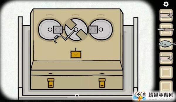 往左转,有一个四斗柜。依次拉开四个抽屉可以找到小刀、鱼和蜡烛。最上方的小盒子是一个简单的解谜小游戏。圆形可以旋转,方块可以拖拽。解开后可以找到第三根蜡烛。