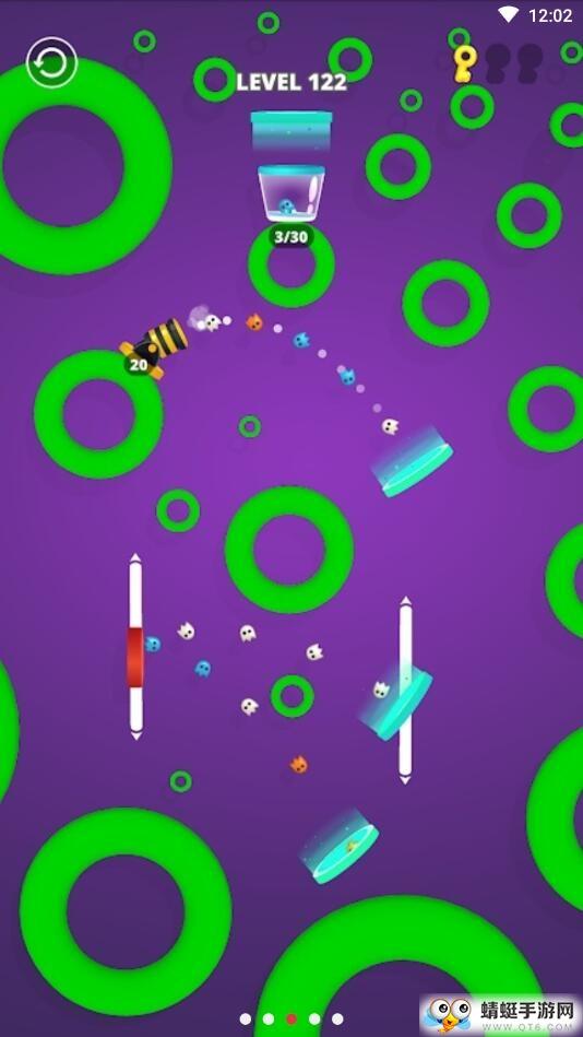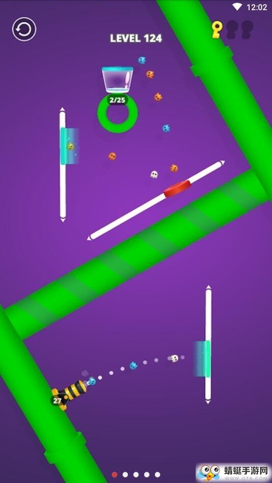3、开始的关卡会比较的简单,后面的关卡会增加很多不同的障碍,障碍会反弹走你发射出的小球。
