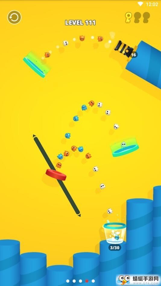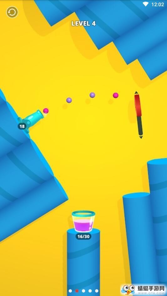 3、利用界面中的得工具把彩色的小球都单射到杯具里,一个关卡只有三次机会,要把握好不要浪费了机会。