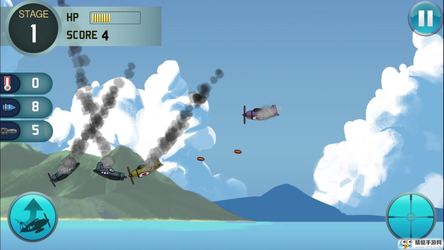 3、敌方也是拥有战斗机,还有地面炮火的存在,你需要去躲避他们的进攻同时击毁他们。