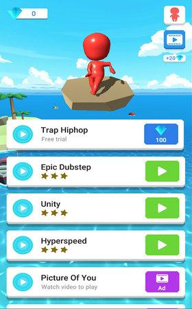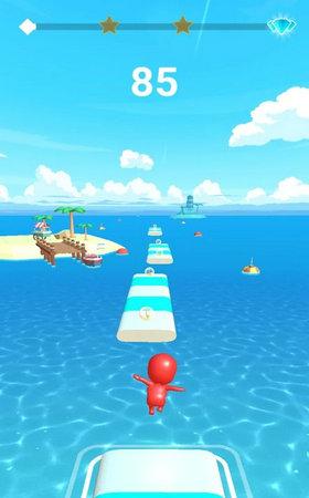 2、一键式触摸玩法,拖动舞者开始奔跑跳跃,保证舞者一直在瓷砖上运行,不要掉落到水中;
