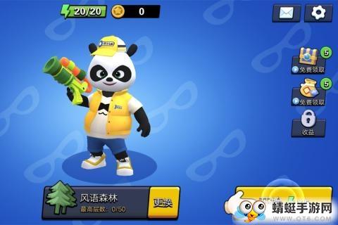 在闯关模式中消耗体力开始游戏,每次需要6点体力,解锁装备成就天赈生成后,可以为熊猫配置更强力的武器,还可以免费领取宝箱奖励;