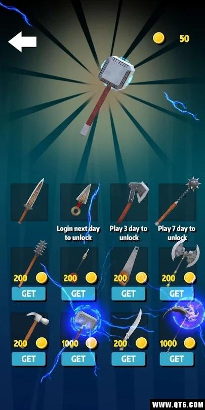 2:超多不同类型的投掷目标等你来解锁,更酷炫的飞斧飞刀以及水果刀等等,不同的刀具拥有不同的效果,
