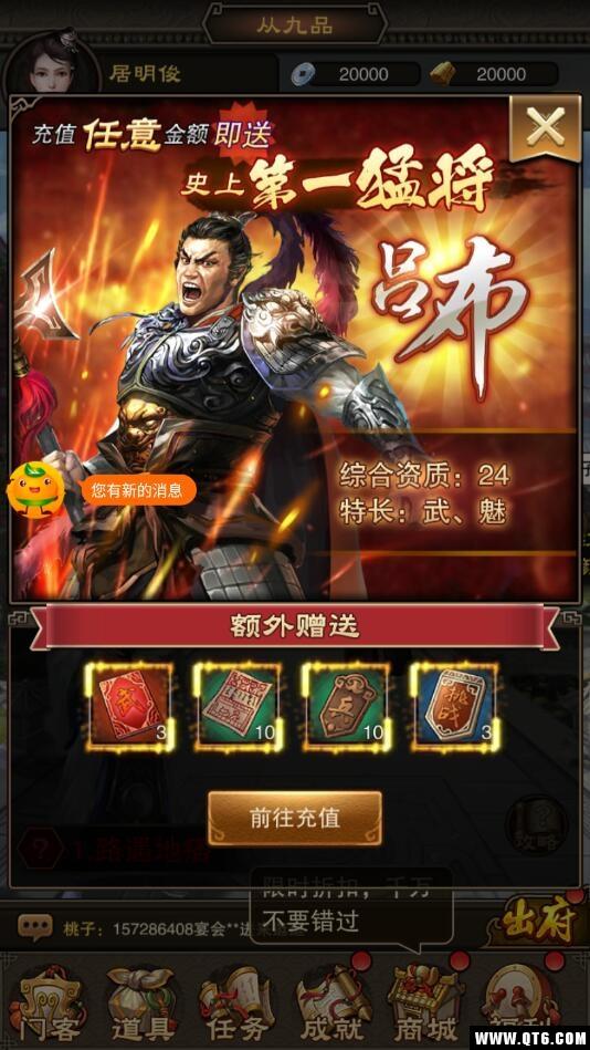 这边建议大家入手个首充礼包,可得到最强武将吕布,初始资质就有24,对他进行重点培养资质道具多用些在吕布身上,过关卡打boss几乎是秒杀!而且后面开启衙门玩法的时候,单挑其他玩家下面的门客攻无不克,佛挡杀佛,神挡弑神,可以说超级划算,顺便说一下游戏中后期达到更高vip等级时可以获得其他强力资质武将;当然如果你是一个平民零氪玩家,也可以选择一个门客进行重点培养,卢俊义、李逵等,只是需要花费更多时间和资源投入,一样可以冲到靠前的排名