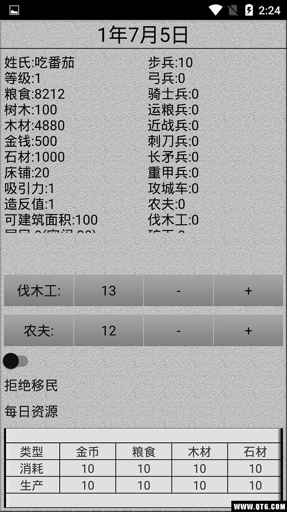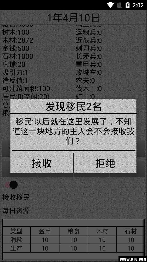 等了一万年终于有移民光顾,结果被我手抖点拒绝了,如果再给我一次机会,我一定会好好招待那两位难民。话不多说进入游戏,各种面板数据尽收眼底,粮食、木材、居民,还有一些战斗兵种,一看就感觉耐玩,但可惜是个半成品,就一个界面,难免有些单调。