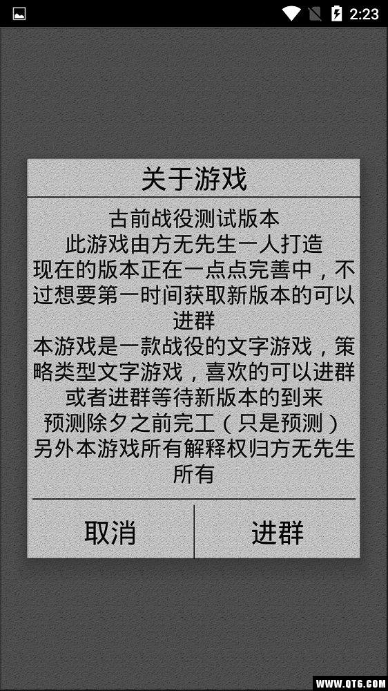 《古前战役》是一款非常好玩的文字游戏,游戏以战争为题材,极具策略的游戏玩法,以文字的方式来进行,在游戏中,玩家需要扮演一个小国皇帝,治理你的国家,让你的人民过上幸福的生活,感兴趣的玩家快来下载试试吧!