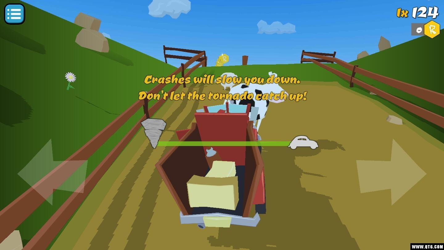在游戏中,玩家需要驾驶不同的载具在道路上狂奔,逃离身后的龙卷风。玩家在游戏中要一边狂奔,一边躲避各种各样的障碍物,还要收集道路中出现的金币。