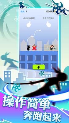 主被劫,快穿上你的忍者套装,出发拯救公主吧!操作简单易上手!点击左边屏幕可以跳跃, 点击右边屏幕可以出招!注意跳跃和出招的时机,连续点击有大招出现!出现敌人时,点击出招击败敌人,遇到公主一定要跳过,不然会撞伤她!每次拯救公主后都会获得报酬!使用金币兑换新的忍者套装!全新上线排行榜,比一比谁击杀的敌人更多吧。