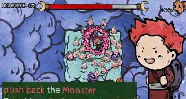 在游戏中,玩家在一块平台上。而平台上面有4个洞会从里面出来一些小怪物。玩家要做的就是和它们互相怼,小怪物会把玩家推下平台。玩家有石化和龙卷风两个技能,合理使用技能在这个平台上坚持到时间结束。