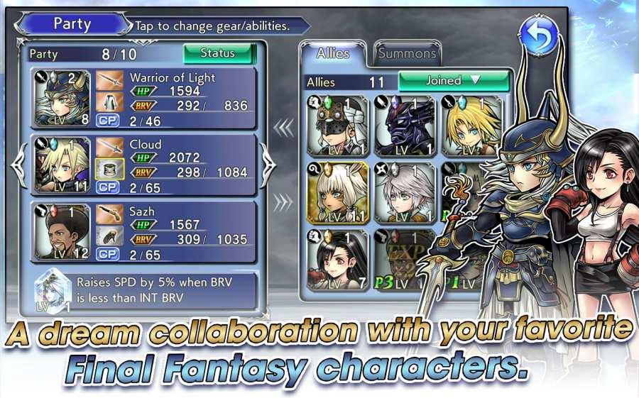 最终幻想纷争系列的手游RPG。在该作中,从初代FF到FF14、FF零式等系列角色大量登场!所有角色都附带语音,围绕着二神展开故事。战斗方面,攻击分为勇气攻击及HP攻击两种方式,指令战斗操作简单但玩法深奥。角色们有着丰富的技能,还能够进行爽快的连携攻击!通过自由组合角色、装备、技能和召唤兽,可以在该作领略到跨越系列的魅力!