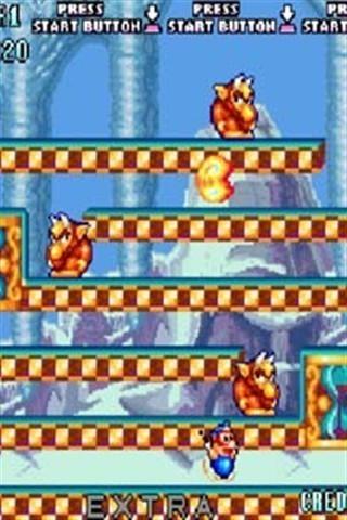 1、《雪人兄弟2》相信资深一点的玩家没有人不玩过,当年经典的街机游戏之一。本作移植的是经典的街机90版。游戏6大关,共计50小关,分为三种难度模式,依次解锁,支持Openfeint。