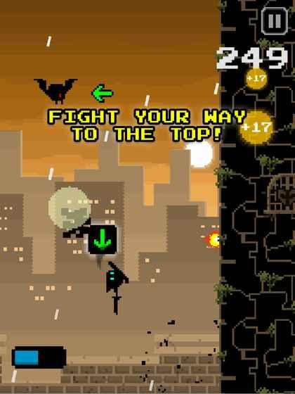在复古风格的环境中,你必须采取爬塔的挑战模式。只有速度够快,突破地心引力的束缚,才可以爬上去,并击败守护塔的骑士。