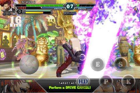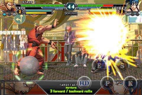 操纵: 因为在手机上操纵,左下圆圈控制行走蹲跳,右手五个键为bc(爆气),闪避,重击(吹飞),拳,脚,和pc端上轻拳轻脚算是简化了,放超必杀技和neo超必杀技都可以一键释放,还算是仁慈的。