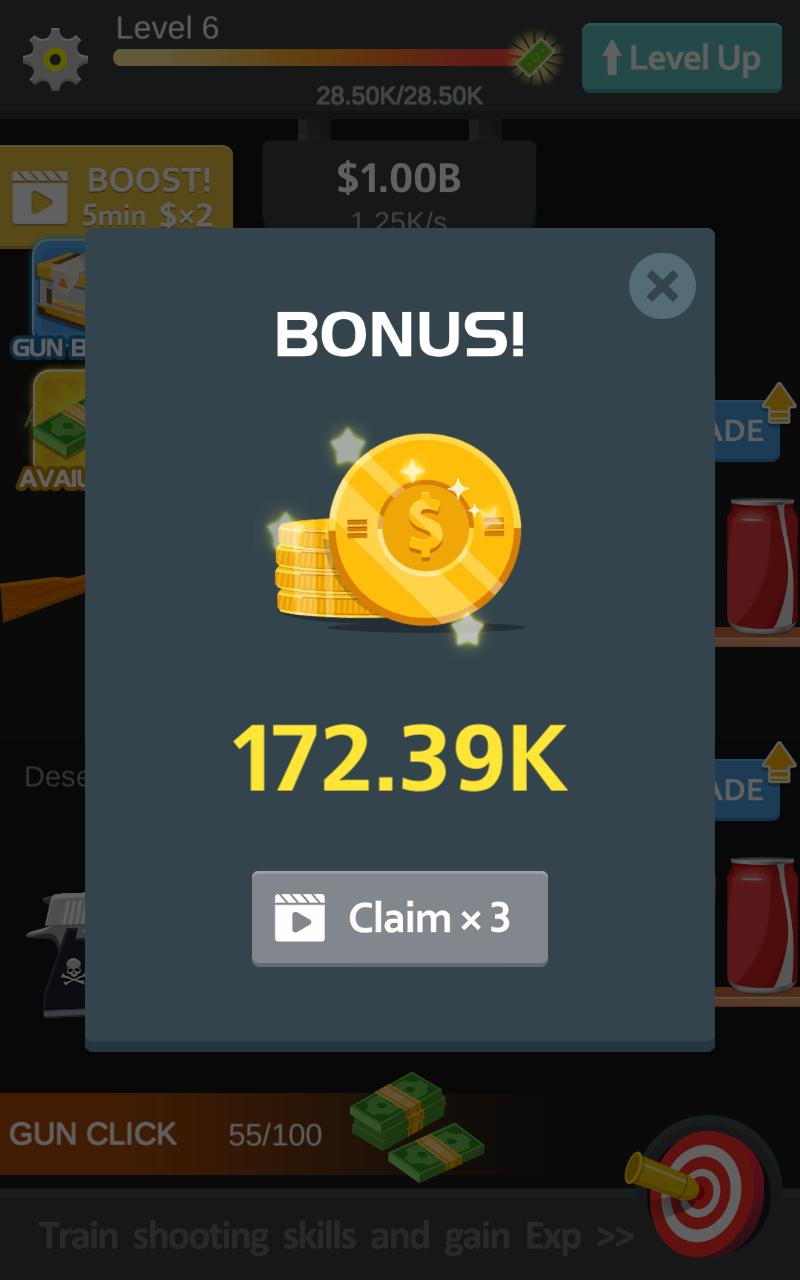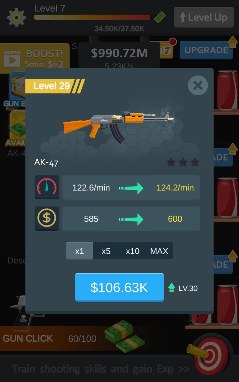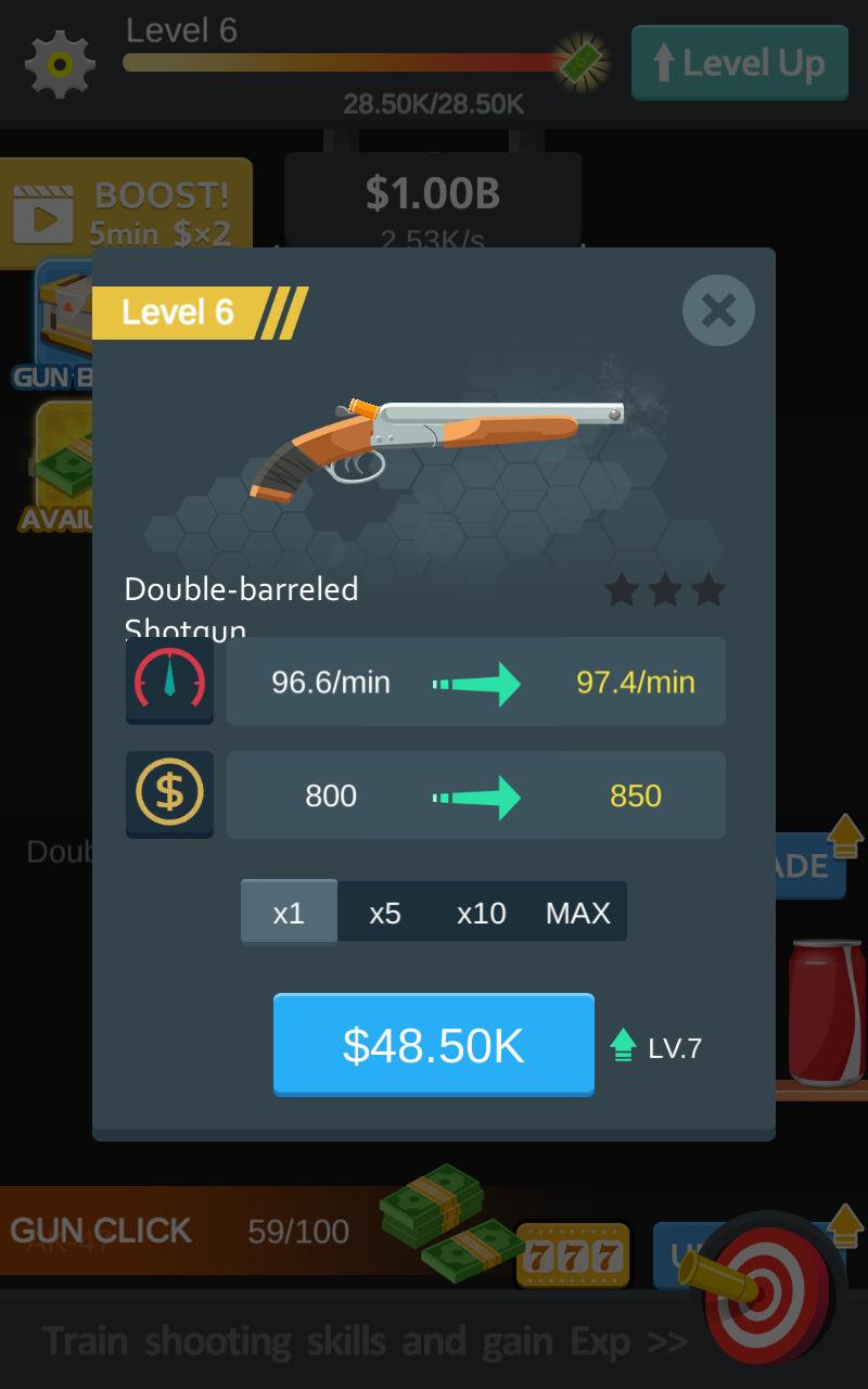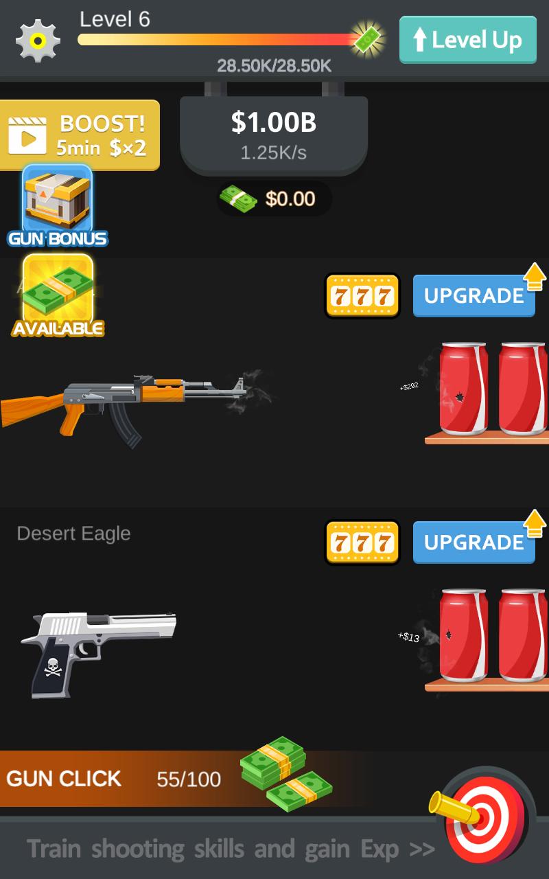 点击枪械,就能加快枪械射击,加快赚钱速度。