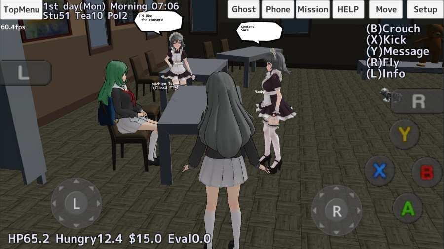 创建新游戏界面可以捏脸,游戏造型非常多样,都是日本卡通动画中常见的换装捏脸元素,玩家可以自由发挥创意;通过移动界面玩家可以瞬移到很多地方;打工、完成任务、杀僵尸可以获得金钱奖励;使用金钱可以购买食物、礼物、还可以玩抓娃娃机....