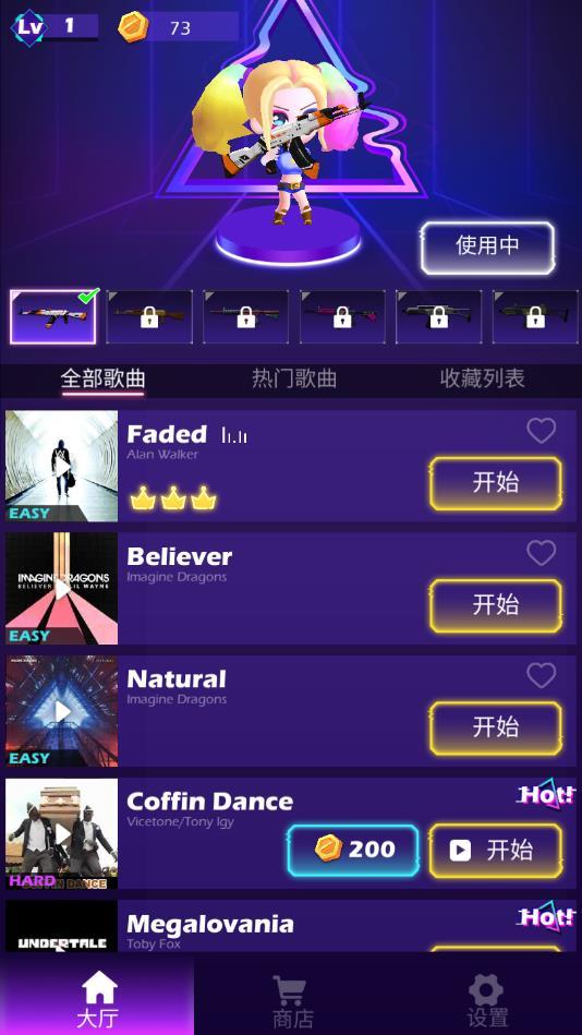 非常炫酷且刺激的节奏射击操作,让你轻松就可以进行一局的开始,不同歌曲的射击难度是不同的,不断进行射击闯关,进行金币的赚取,用以进行枪支的解锁。