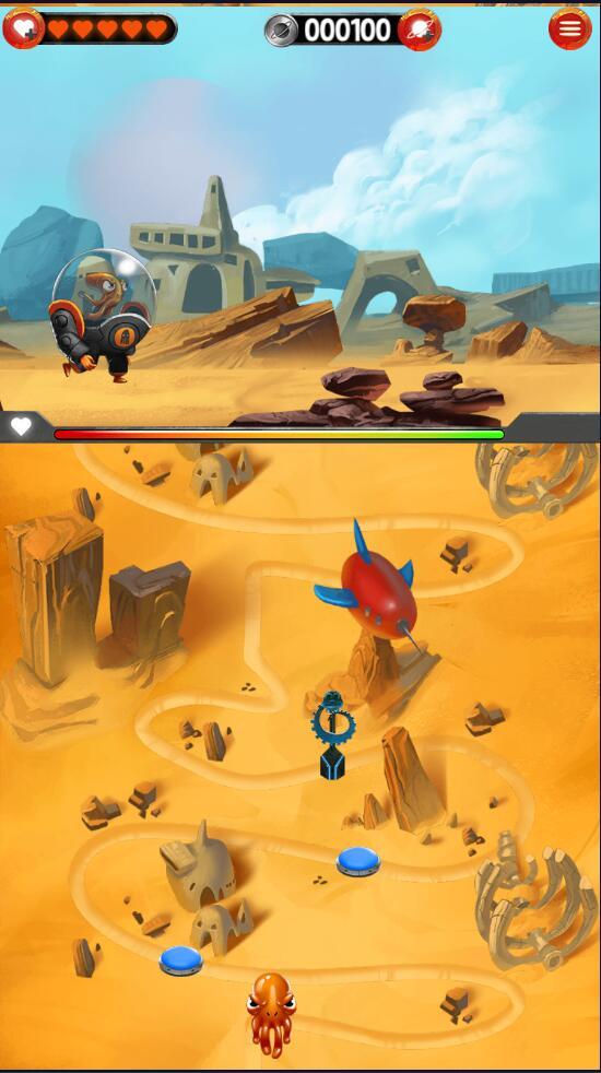 大章鱼入侵,进入游戏后玩家可以看见整个屏幕被分为上下两部分,上部分是章鱼冒险行程的具体内容,而下面则是章鱼在整个地图中所处的一个位置,而当章鱼遇到敌人之后下方的屏幕也会有所变化,从地图变得了获得枪械的一个地方,玩家点击每一个小格子来寻找枪械。